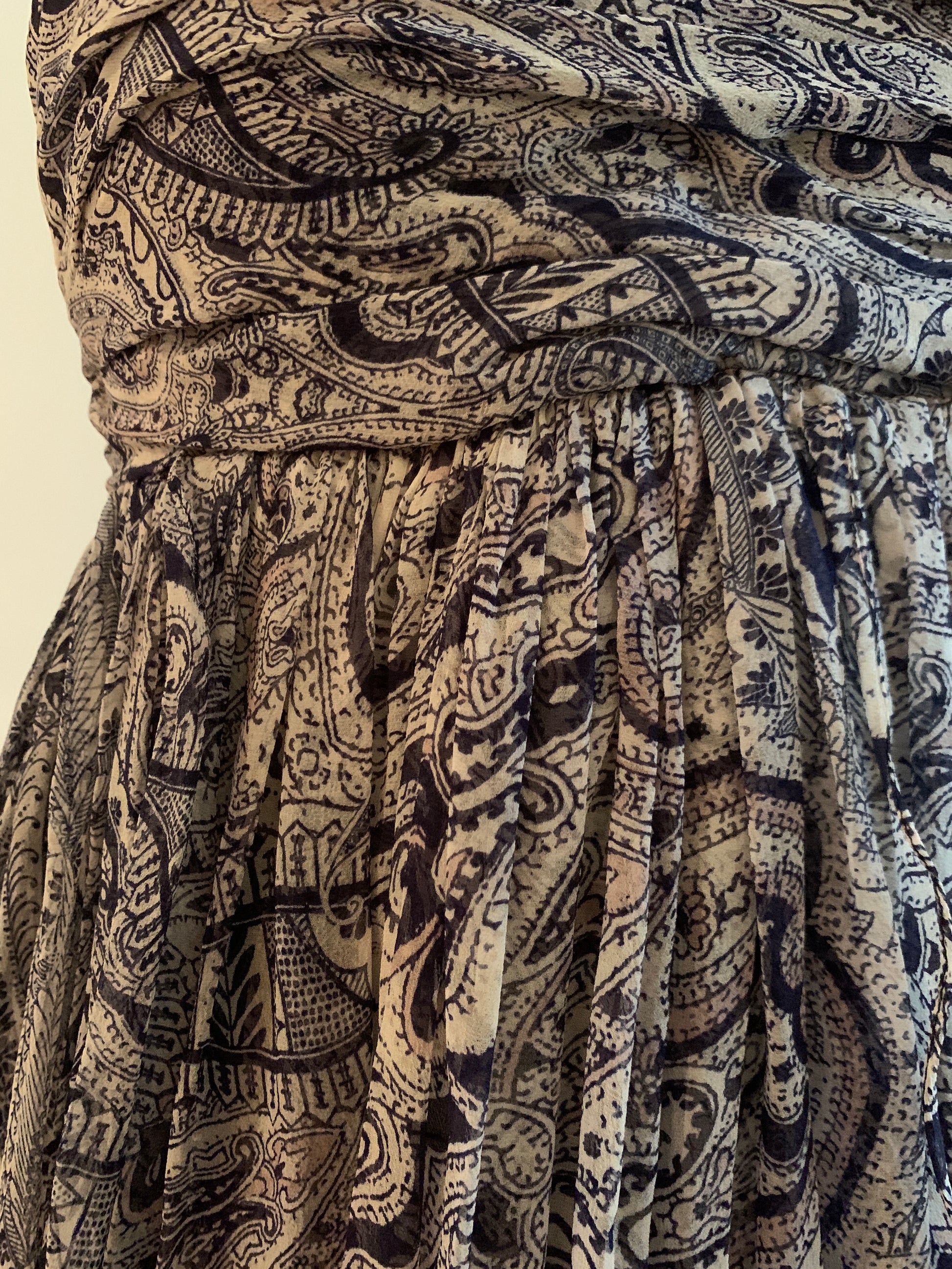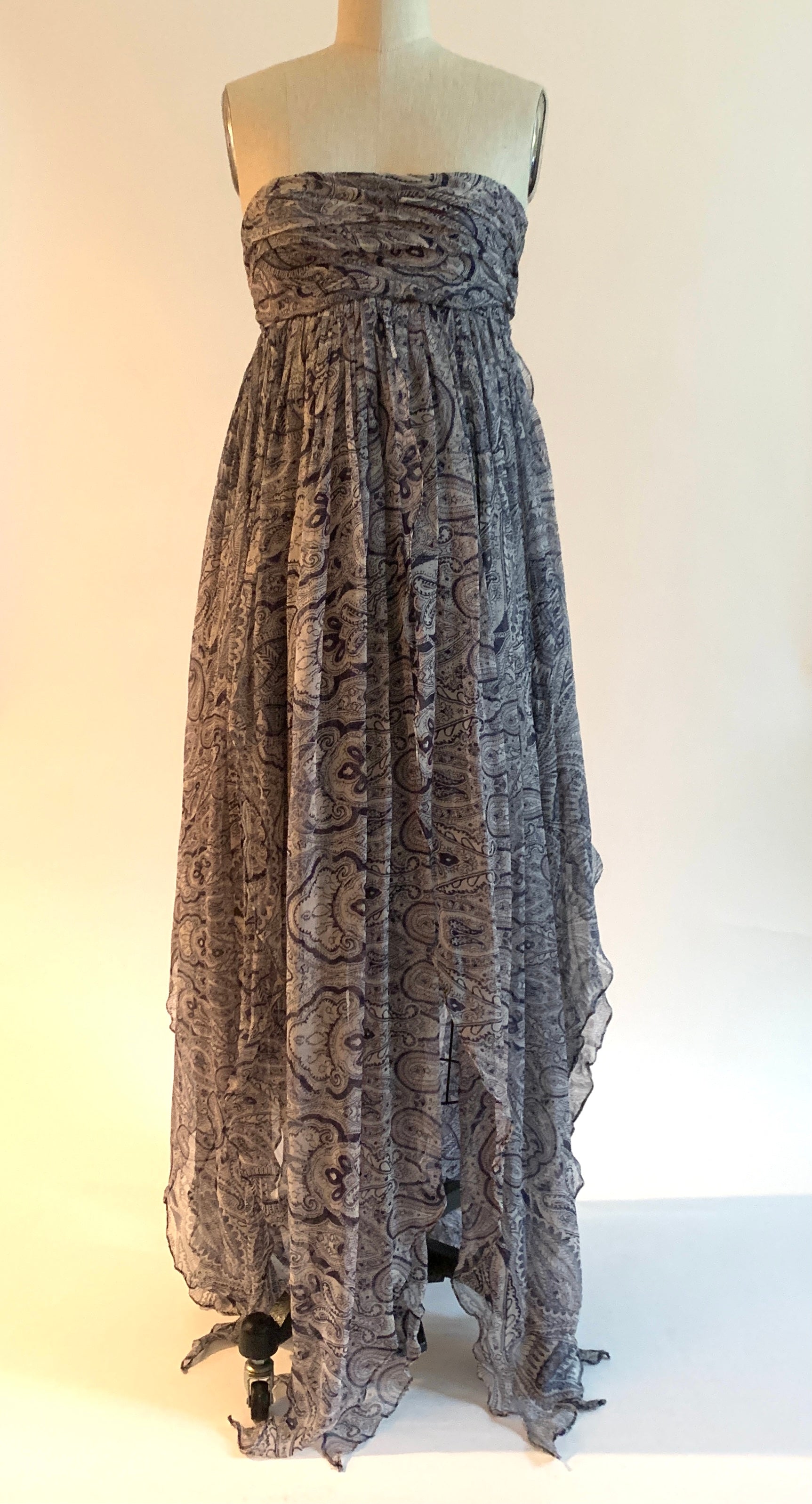Amazing vintage 2000s Alexander McQueen floaty silk chiffon strapless dress in a blue and white paisley with a few soft pinkish-red accents throughout, circa 2008. Soft pleats at bust, skirt hangs in separate strips/panels that create beautiful movement. Built in bustier at top. Fastens at back with two hook and eyes brassiere style. Two bits of fabric at back tie over the fastener and drape over a small peekaboo opening.