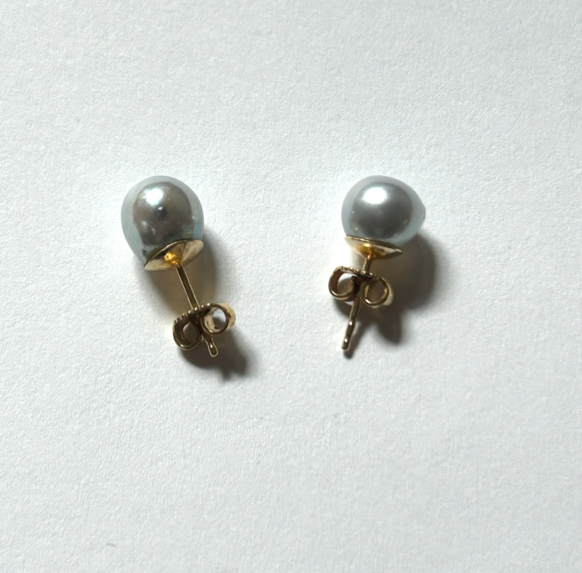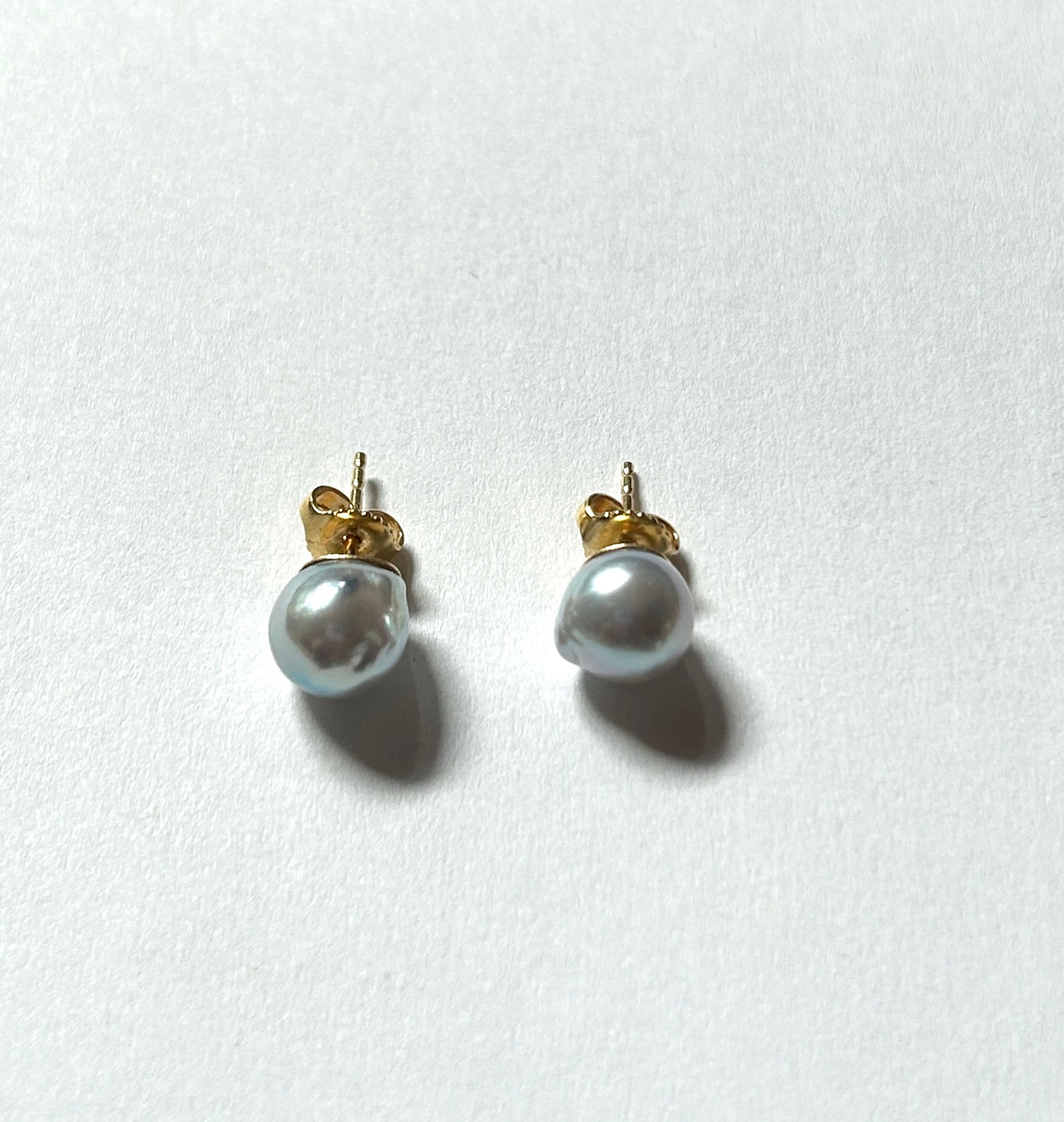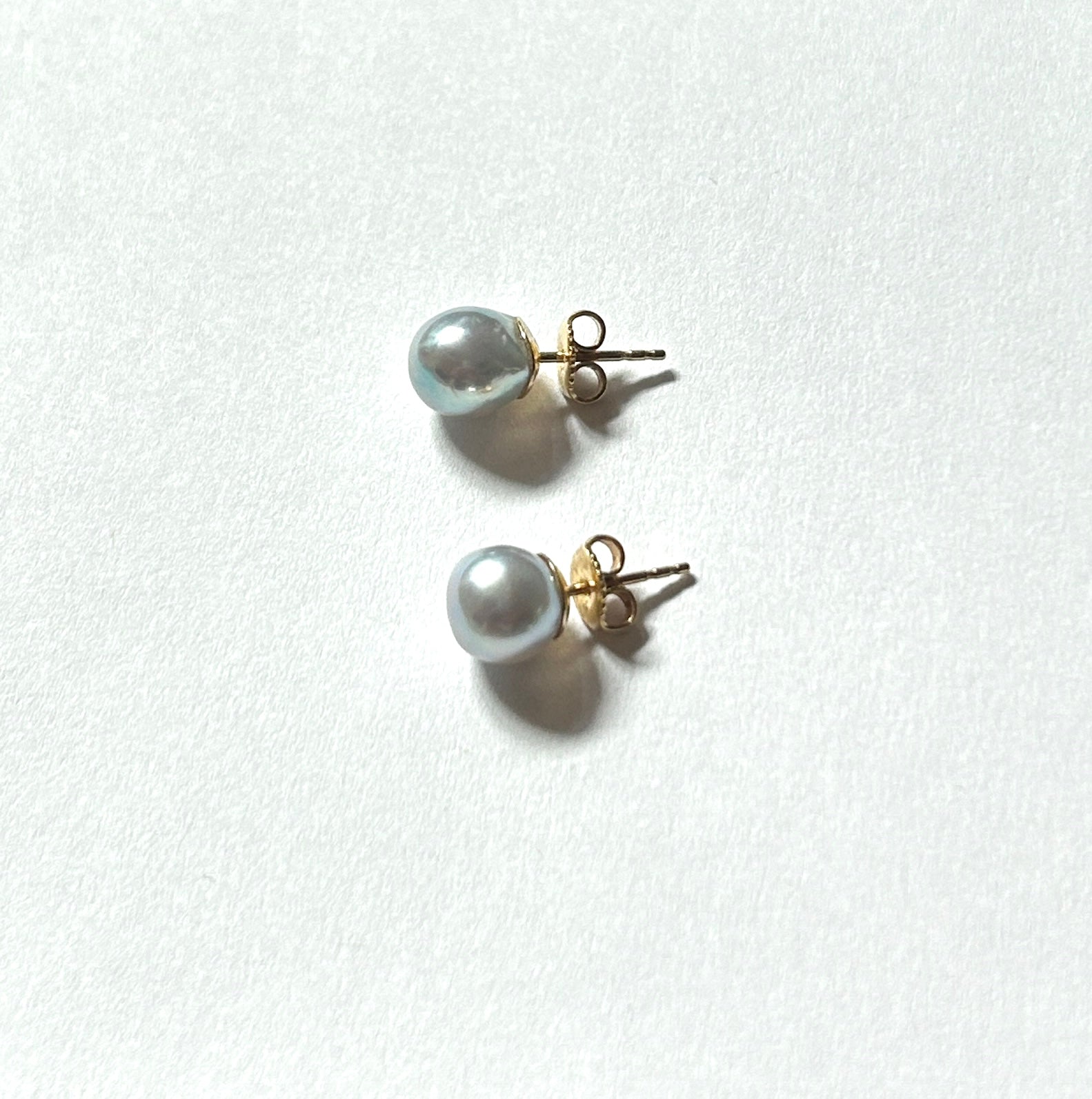Gump's signature blue Akoya cultured pearls set with yellow gold. A timeless classic, pearl earrings have been a mainstay in Gump's fine jewelry assortment for decades. Each pearl is carefully selected for quality, color and shape. Blue baroque Akoya cultured pearls, 8mm. 14-karat yellow gold. Pierced.